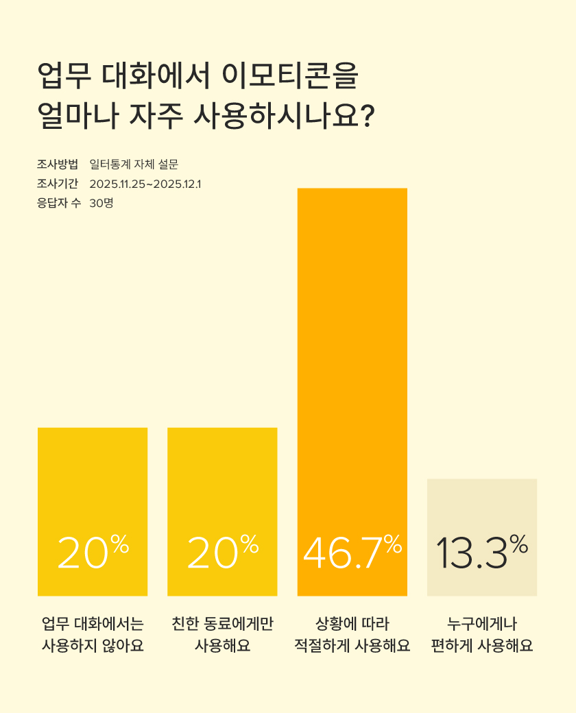 하지만 모든 사람이 이모티콘을 반기는 건 아니었어요. 공식적인 업무 대화에서는 거의 사용하지 않거나, 친한 동료들에게만 제한적으로 사용한다고 답한 응답자도 각각 20% 정도로 나타났는데요. 이들은 이모티콘이 전문성과 거리감 유지에 방해가 된다고 느꼈어요. 연차가 높아질수록 이러한 업무적 경계를 더 분명하게 구분하려는 모습도 보였답니다.