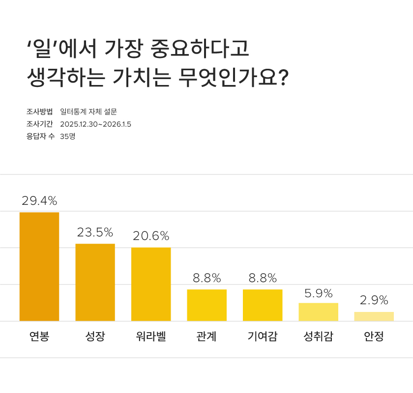์ฐ๋ด(29%), ์ฑ์ฅ(23%), ์๋ผ๋ฐธ(20%)์ด โ์ผ์์ ๊ฐ์ฅ ์ค์ํ ๊ฐ์นโ 1~3์์ ์ฌ๋์ด์. ์ด๋ ํ๋๊ฐ ์๋์ ์ผ๋ก ์ ํ๋๊ธฐ๋ณด๋ค ์ธ ๊ฐ์ง๊ฐ ๋น์ทํ ๋น์ค์ผ๋ก ๊ณ ๋ฅด๊ฒ ์ธ๊ธ๋๋ค๋ ์ ์ด ๋์ ๋์ด์. ์ด์ ์ฐ๋ด, ์ฑ์ฅ, ์๋ผ๋ฐธ์ ์ด์ ์ผํฐ๊ฐ ๊ฐ์ถ๋ฉด ์ข์ ์กฐ๊ฑด์ด ์๋๋ผ, โ์ผํฐโ ํ๋ฉด ๊ฐ์ฅ ๋จผ์ ๋ ์ฌ๋ฆฌ๋ ๊ธฐ๋ณธ๊ฐ์ด ๋์์์ ์ ์ ์์ด์.